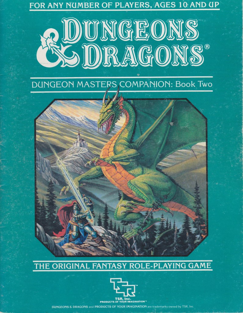 Nos pasamos 2-4 años jugando intensamente cada sábado por la tarde, algún domingo y fiestas de guardar, desde los 13 a los 16 años (el primer año comenzamos con una mezcla de reglas simplificadas que me hice yo, mezcla del sistema lucha – ficción de 2 dados y del D&D básico original, que llamábamos T&M – Tragones y Modorras). De modo que podíamos completar campañas enteras, ver crecer a los personajes y “escribir” una historia continuada entre todos. 1 DM y 4-6 personajes jugadores por sesión. Cuando alguno tenía que faltar inexcusablemente, pero quería que su personaje progresara, permitía que lo condujeran los demás o yo mismo en modo PNJ (Personaje No Jugador, lo interpreta el DM), pero con cuidado de no ponerlo en demasiado peligro. Yo inventaba los escenarios y las aventuras, a veces basándome en módulos comprados y todo era muy dinámico, llegamos a usar los manuales básico y experto completos (hasta niveles 14, personajes ya de liga Compañía del Anillo…) y parte del companion, para reglas extra de enfrentamiento y monstruos premium.